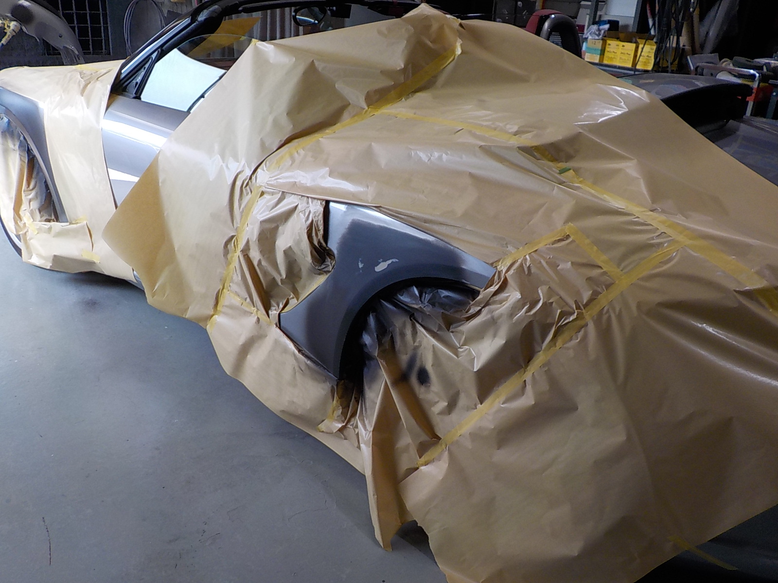 鈑金終了後、鋼鈑や旧塗膜の状態などに合わせて2液型プライマーを塗布し塗装の準備に入ります。