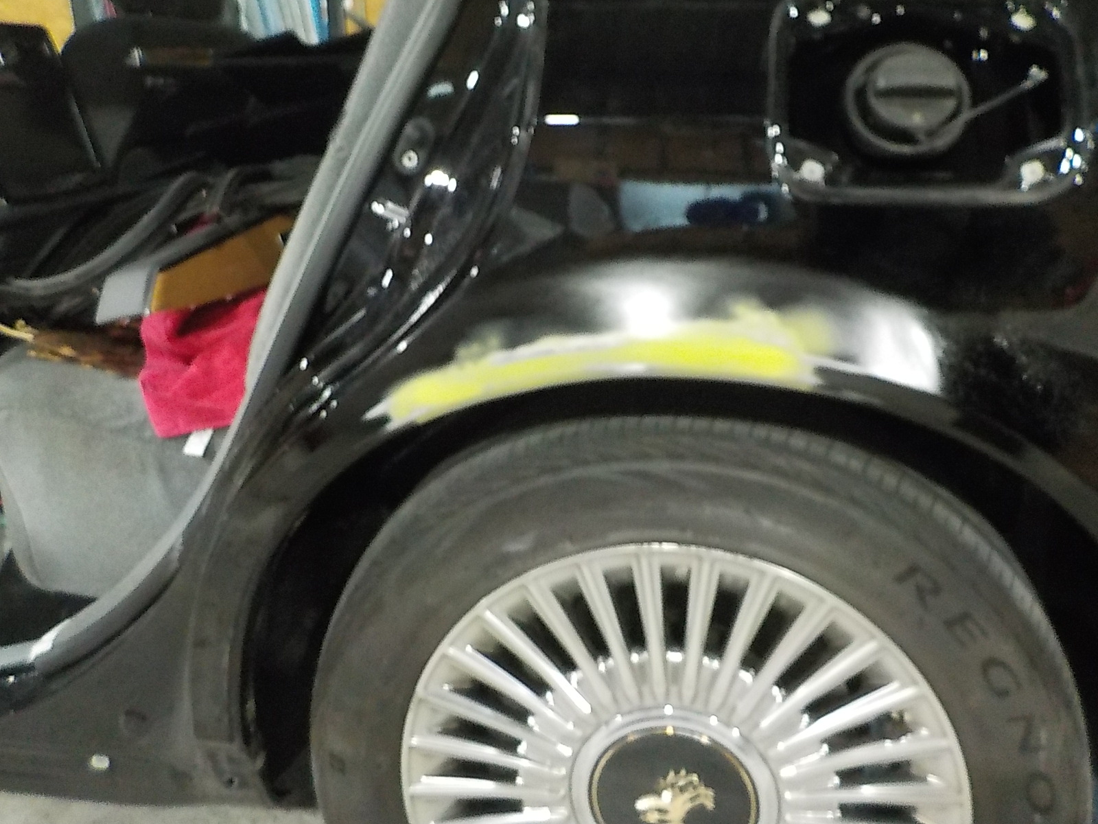 左リアフェンダー、リアドアは損保アジャスター立会い時に本件での損傷と認定されたのですが、リアバンパー、タイヤホイールは調査してからとの事でしたので、認定されたパネルから作業を進めていきます。