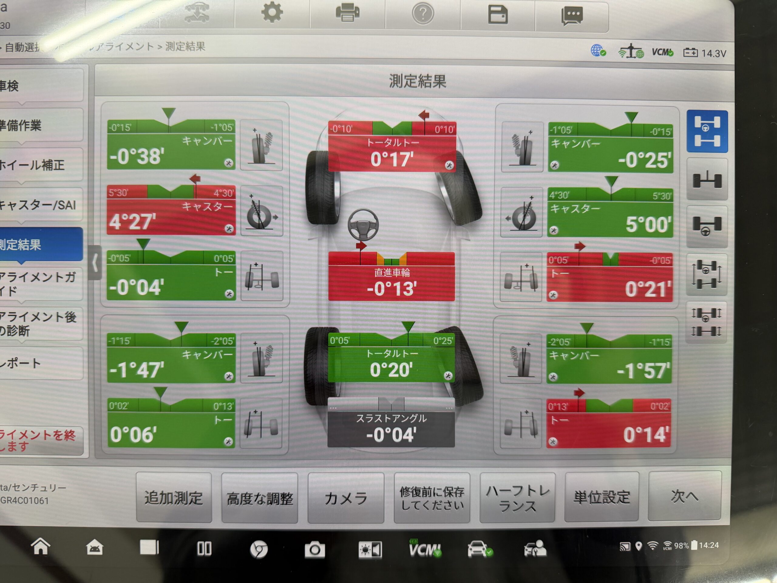 タイヤホイールも損傷が確認され新品交換しましたが、一見そこまでの損傷では無く見えても、アライメント測定をするとやはり規定値からずれている場合があるので、弊社では必ずアライメント測定、調整をしてからご納車致します。